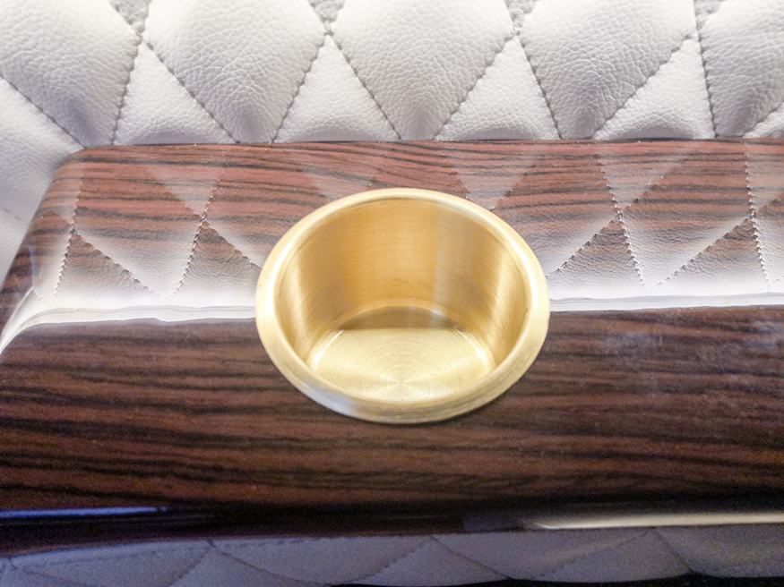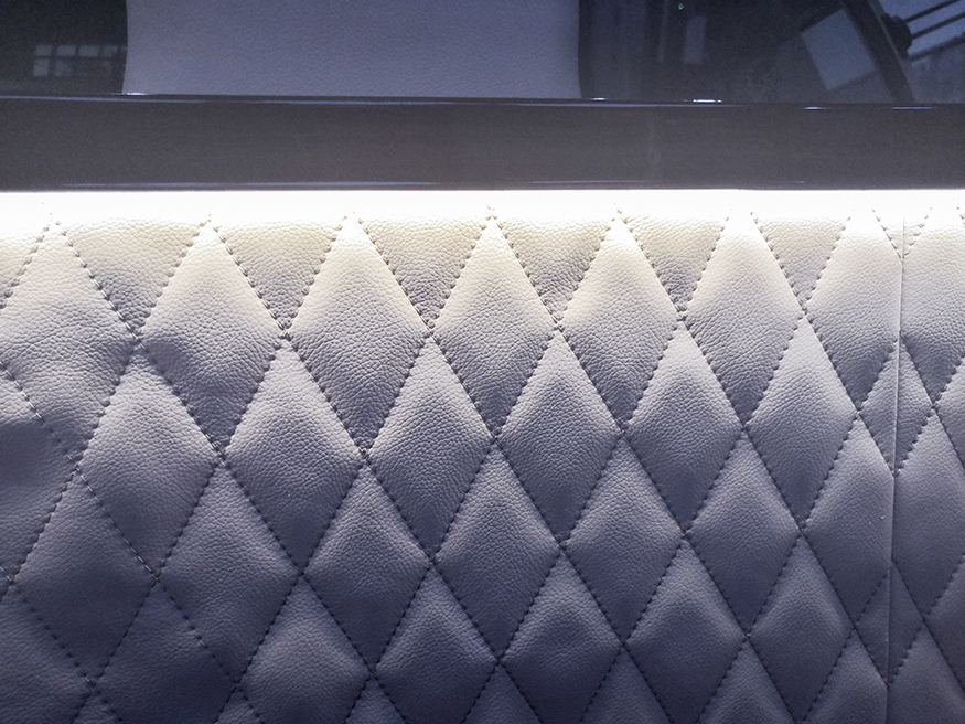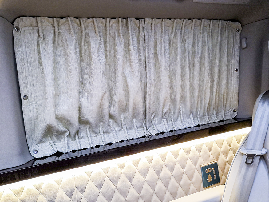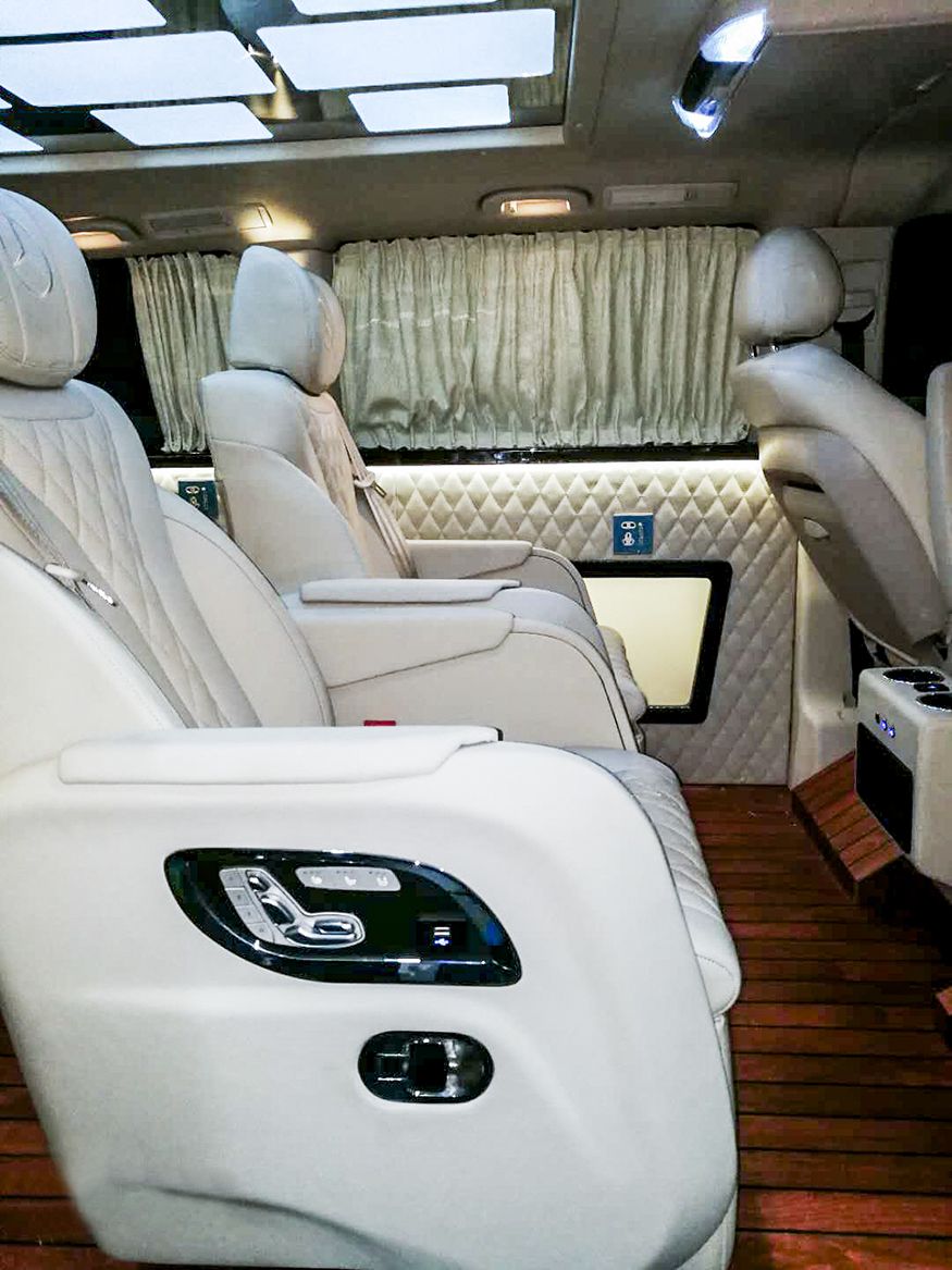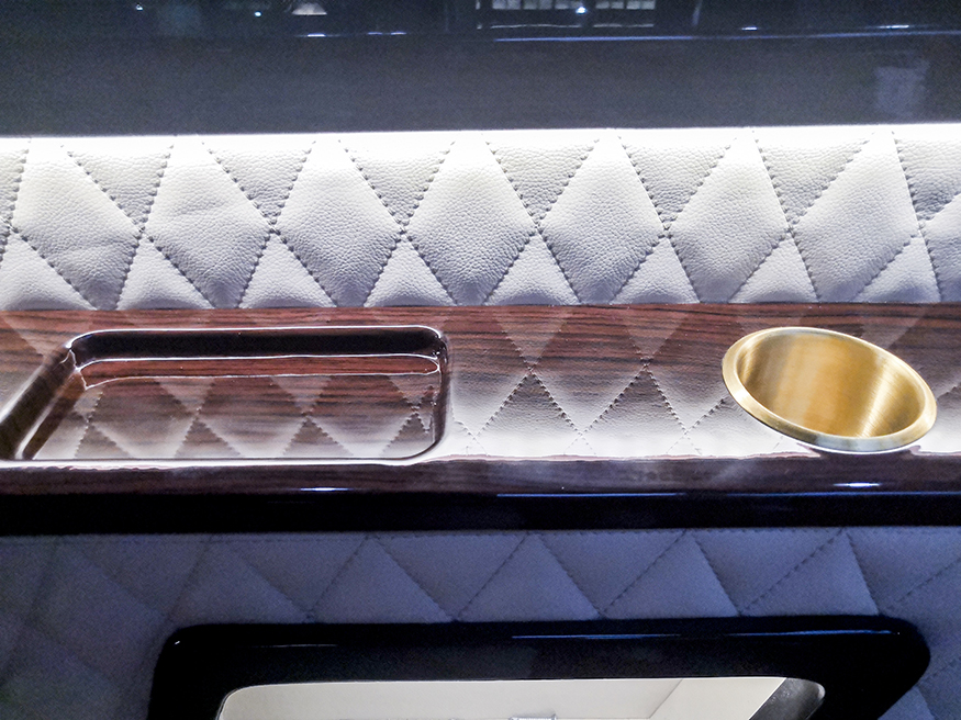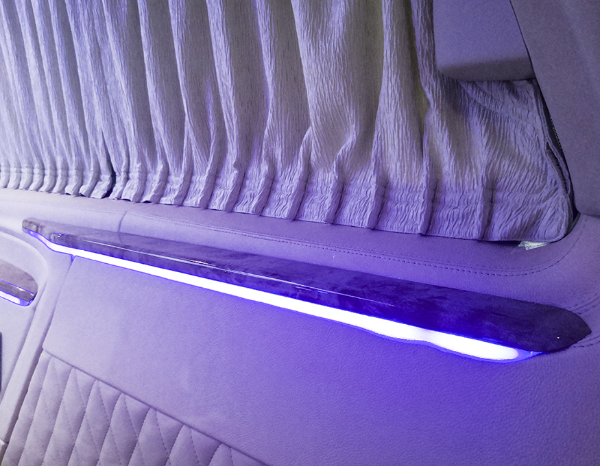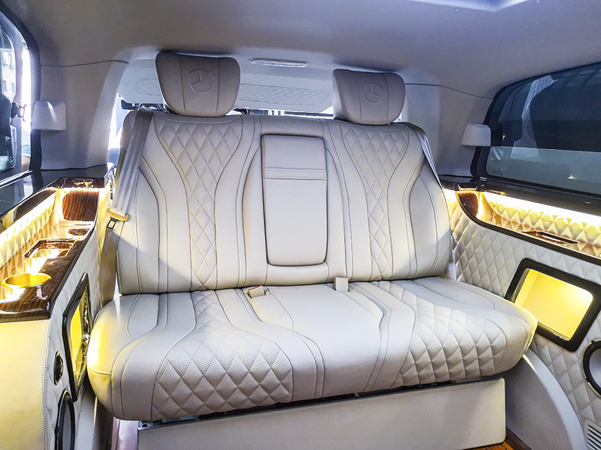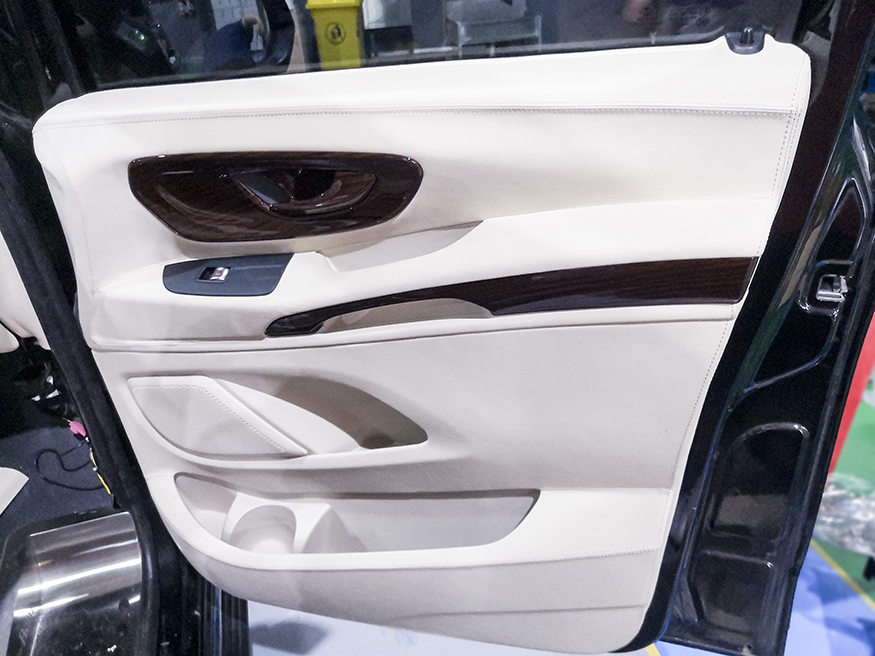 木装地板:缅甸国宝级柚木、本为豪华游艇选用珍惜特质,无需上油维护,可耐海水侵蚀,纹理恒久亮丽,色泽不退。铺设车内贵宾踏足之际,即可感受优雅印