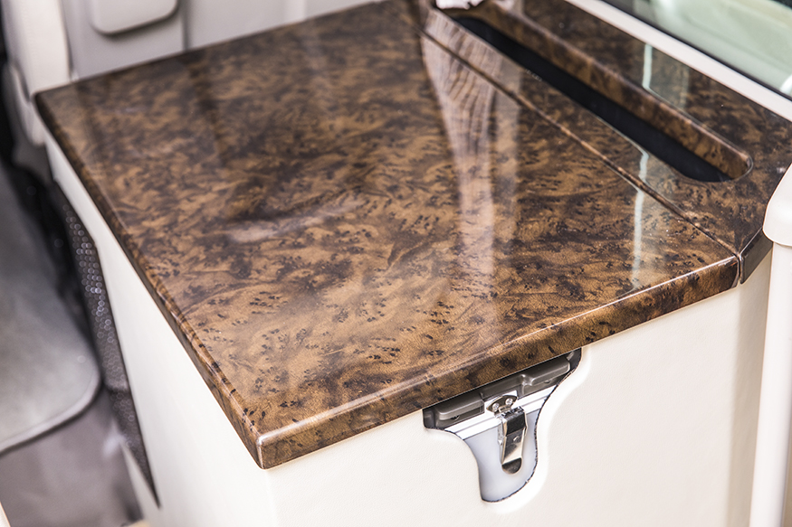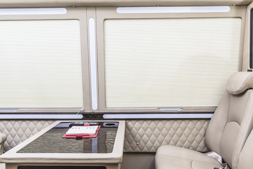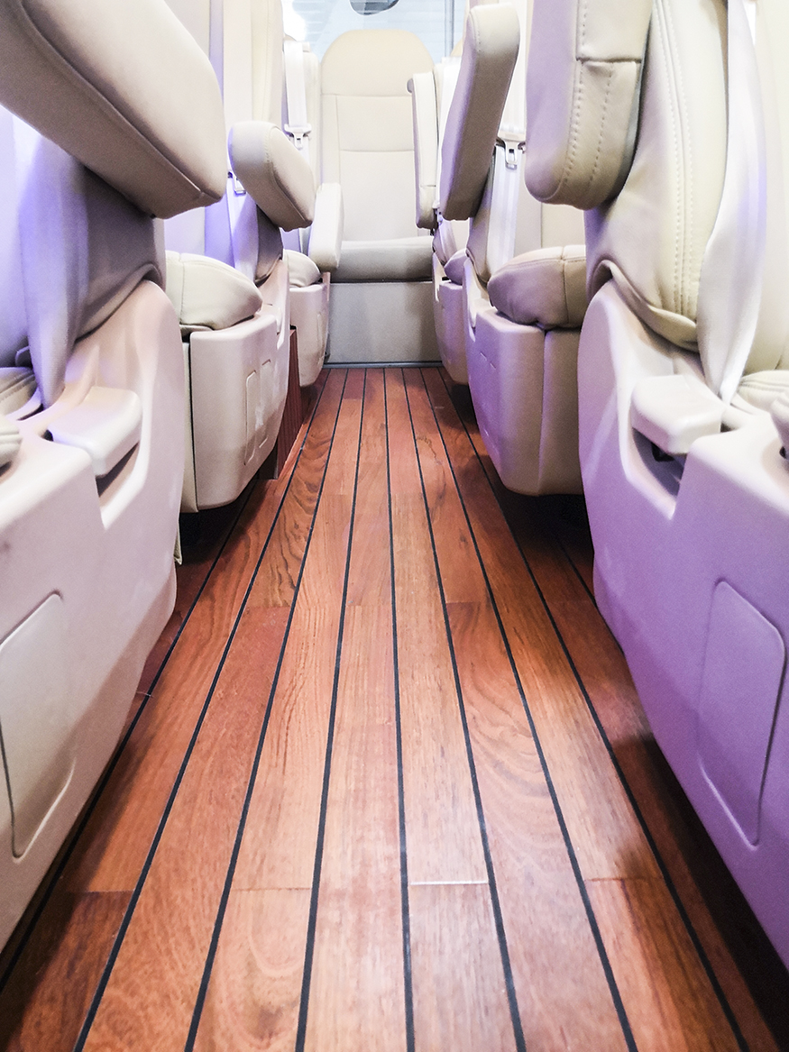 木装地板:缅甸国宝级柚木、本为豪华游艇选用珍惜特质,无需上油维护,可耐海水侵蚀,纹理恒久亮丽,色泽不退。铺设车内贵宾踏足之际,即可感受优雅印